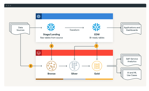 Move data into Delta Lake’s Bronze/Silver/Gold layers, leveraging COPY INTO and Auto Loader, or the Spark Snowflake Connector for smaller datasets. |