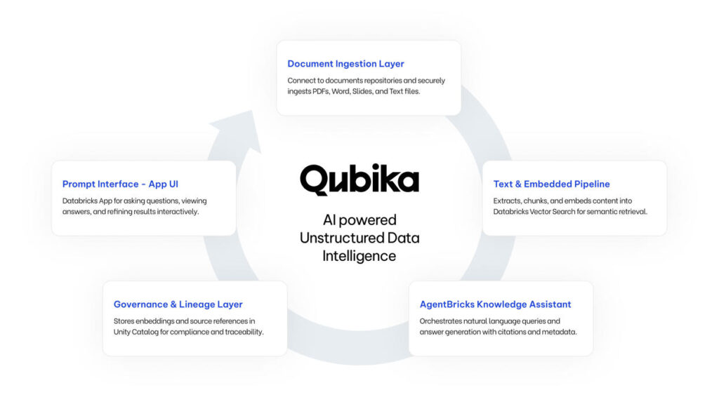 Qubika’s Unstructured Knowledge Assistant Accelerator transforms enterprise documents into a governed, searchable, and queryable knowledge layer using semantic search and AI-powered Q&A on Databricks, dramatically reducing time spent searching while preserving lineage, security, and trust.